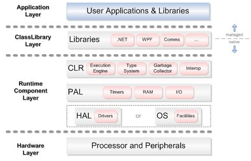 The application model of .NET Micro Framework is very similar to WPF. It has native CLR/PAL and HAL and managed libraries.